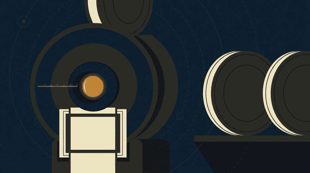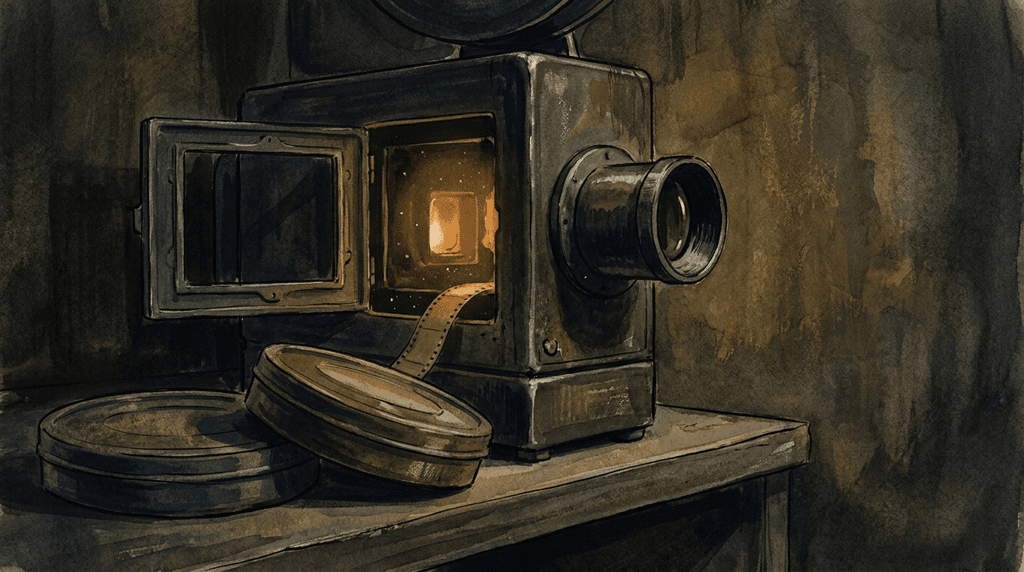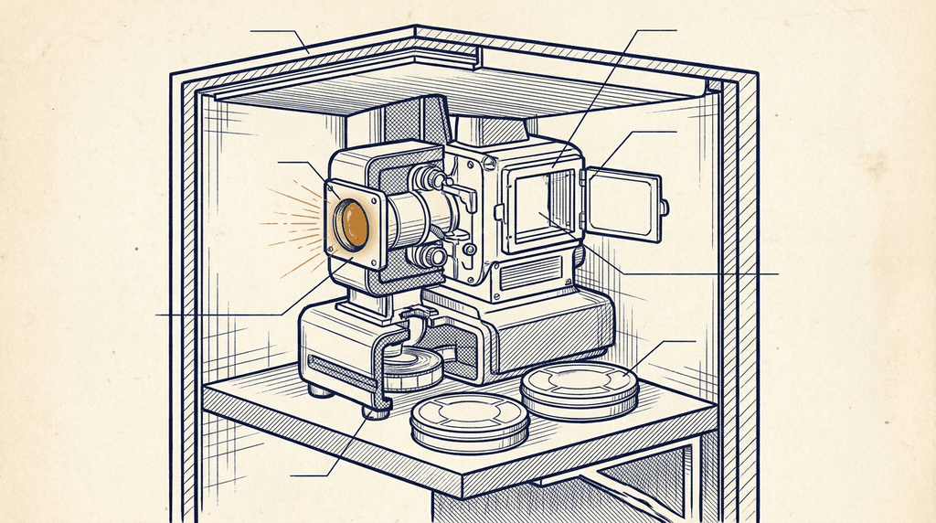 Thinking: The image must carry the stopped-but-still-running feeling. The literal read — a projector in a booth — would miss it. The move is to make the machine feel on while giving it nothing to do: no reel threaded, no window to a theater, no beam — just the lamp contained inside its own housing, glowing for no one.