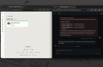 - Bidirectional chat. Messages from the Primeta UI reach your agent; agent replies play back through the avatar with TTS.