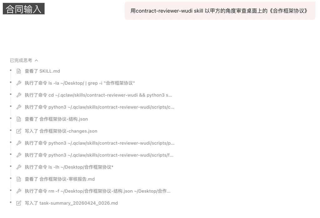 中文合同审核 Skill,专为 OpenClaw / Claude AI 设计的智能合同审查工具。 以 修订痕迹(Track Changes) 为核心输出,直接写入 Word 文档,所见即所得。